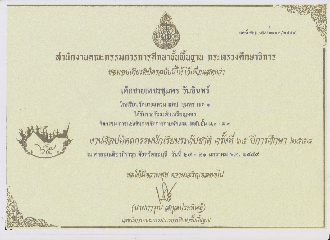 ได้รับเหรียญทองในการแข่งขันการจัดการค่าพักแรม กลุ่มสาระกิจกรรมพัฒนาผู้เรียน ในการแข่งขันศิลปหัตถกรรมนักเรียนระดับชาติ ครั้งที่ 65 ณ ค่ายลูกเสือวชิราวุธ อำเภอศรีราชา จังหวัดชลบุรี ระหว่าง วันที่ 29 มกราคม - 2 กุมภาพันธ์ 2559                        		 |
