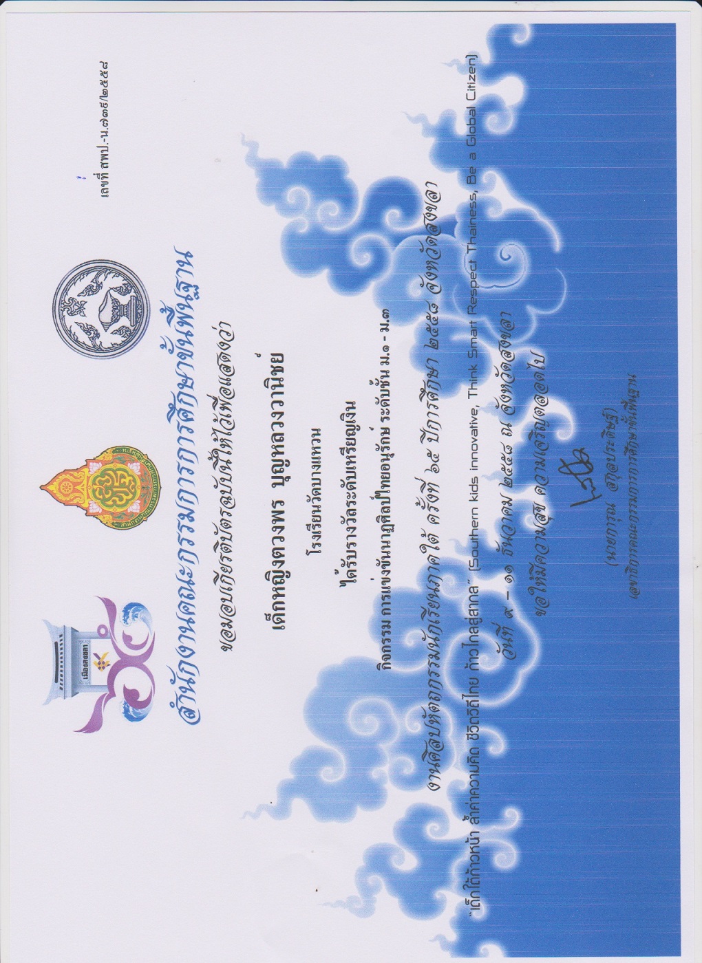 ได้รับรางวัลเหรียญเงินนาฏศิลป์ไทยอนุรักษ์ ในการแข่งขันศิลปหัตถกรรมนักเรียนระดับภาค ณ มหาวิทยาลัยราชภัฏสงขลา จังหวัดสงขลา