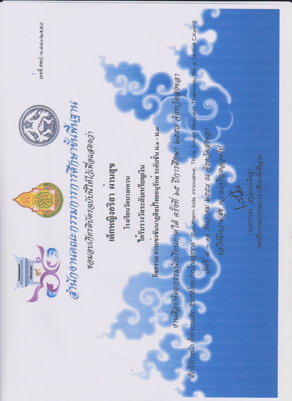 ได้รับรางวัลเหรียญเงินนาฏศิลป์ไทยอนุรักษ์ ในการแข่งขันศิลปหัตถกรรมนักเรียนระดับภาค ณ มหาวิทยาลัยราชภัฏสงขลา จังหวัดสงขลา
